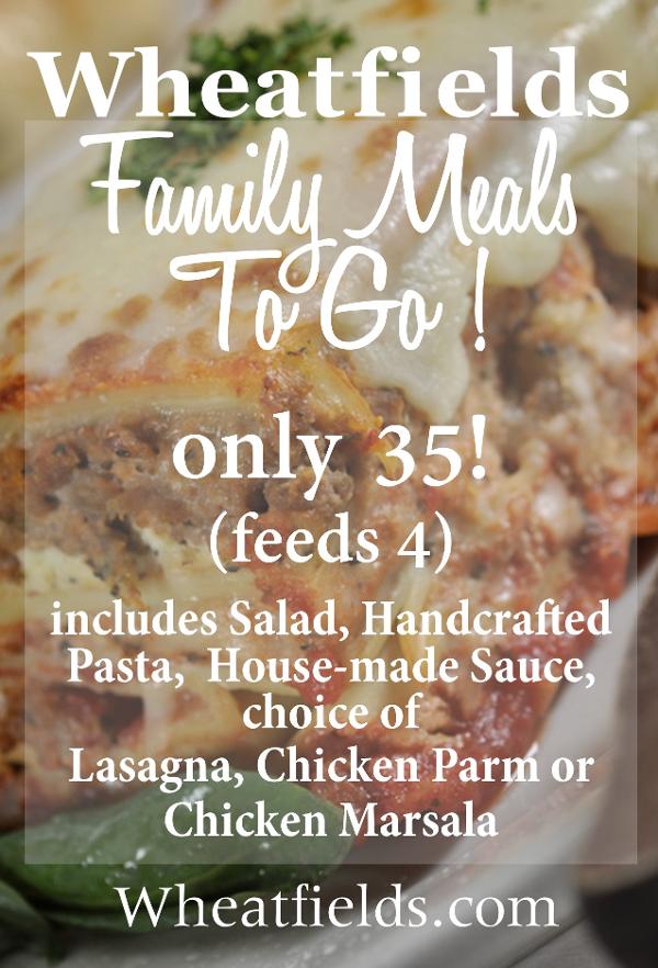 Feed 4 for only $35! Family Meal includes your choice of Caesar or Market Salad, Lasagna, Chicken Parm or Chicken Marsala, your choice of handcrafted pasta, and your choice of house-made sauce. All for only $8.75 per person!